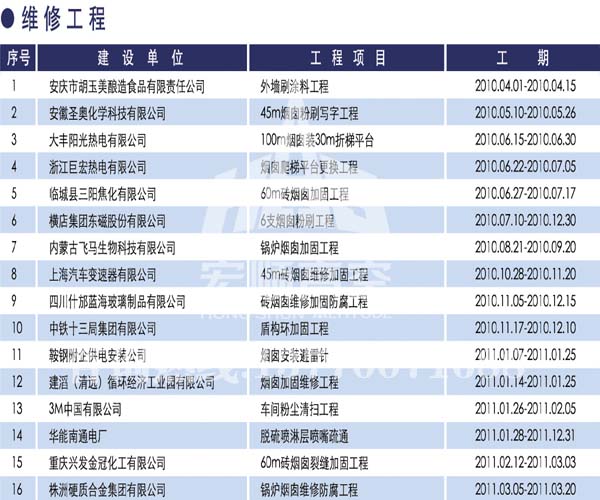 宏順建設工程有限公司是國家批準成立的專業(yè)高空作業(yè)企業(yè):承攬過(國內(nèi).國外)煙囪新建、煙囪防腐、磚煙囪新建、煙囪改造、煙囪維修、煙囪脫硫防腐、煙囪拆除加高、煙囪滑膜等高空作業(yè)工程。具有“不搭腳手架 、 不需要停產(chǎn)”施工特點。